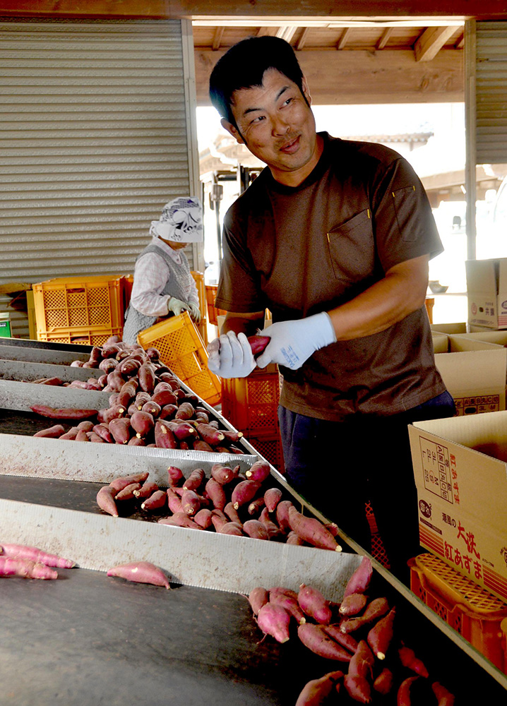 大洗地区カンショ生産部会の藤沼寛之さん(39)は、18歳で就農し、妻の恵さん、母のくにさんの3人でカンショ(サツマイモ)4ヘクタールのほか、ダイコン、ニンジン、キャベツなどを栽培しています。
